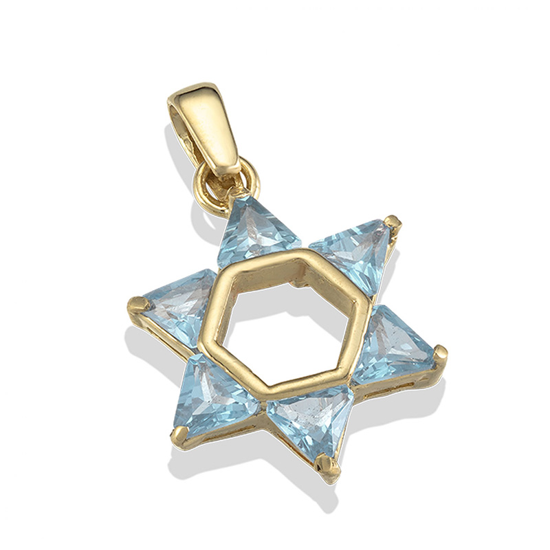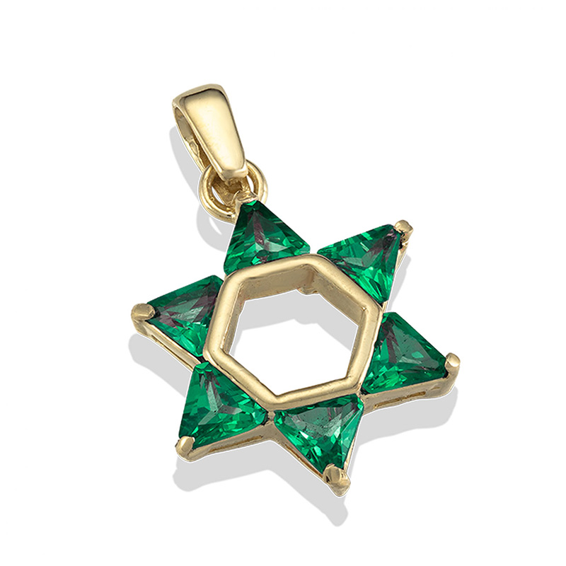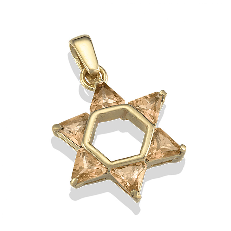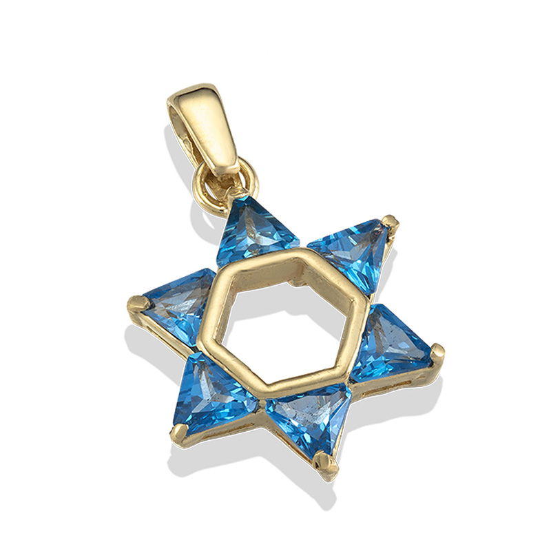תליון זהב 14K בצורת מגן דוד בשיבוץ אבנים משולשות בצבע לפי בחירת לקוח.