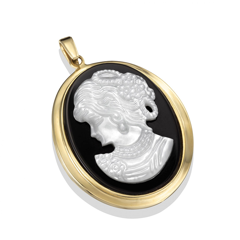 תליון זהב 14K אובלי עם מסגרת זהב עם הטבעת דמות אישה לבנה על-גבי רקע שחור.