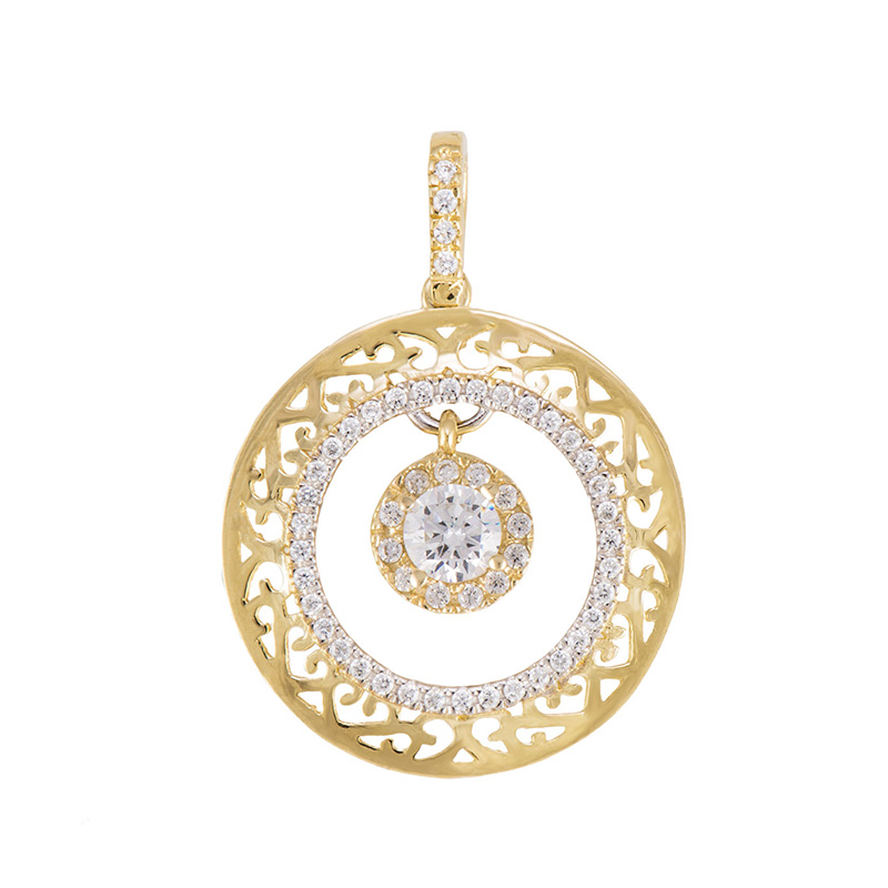 תליון רדיאלי זהב צהוב 14K רדיוס היקפי דמוי תחרה רדיוס פנימי משובץ זירקונים לבנים קטנים ובמרכז זירקון תלוי לבן. גם התלי משובץ זירקונים לבנים.