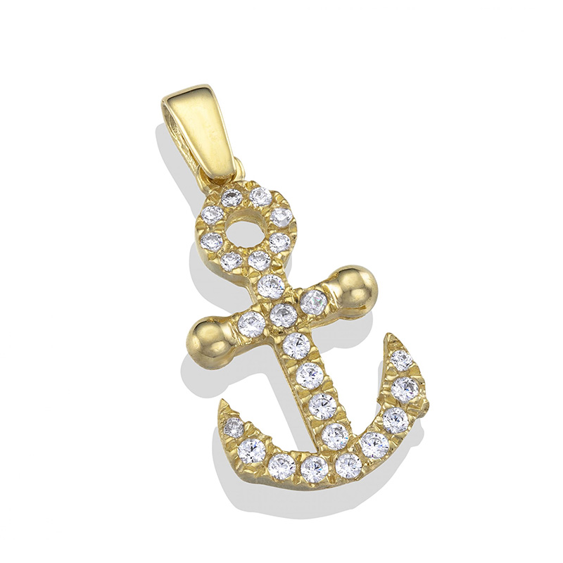 תליון עוגן מזהב צהוב K14 משובץ אבני זירקון לבנות.