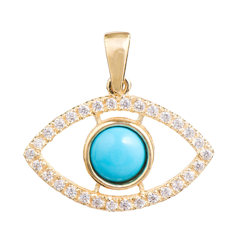 תליון זהב צהוב K14 בצורת עין, משובץ זירקונים לבנים ובוהקים ואבן טורקיז מרכזית.