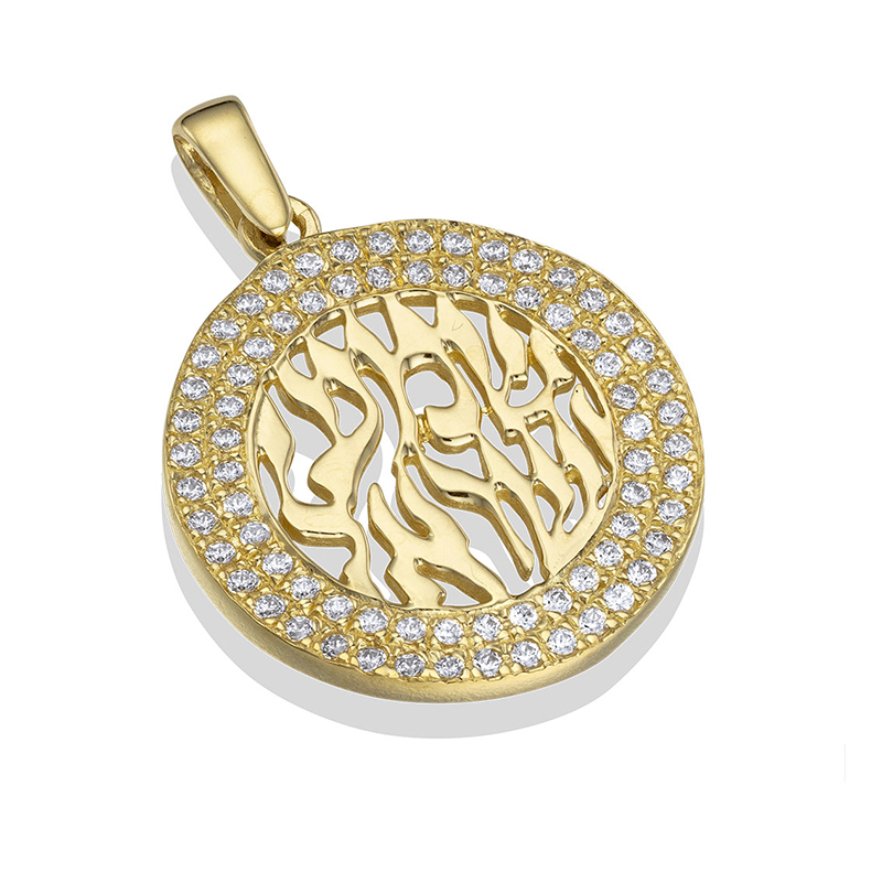 תליון זהב צהוב K14 עגול, עם כיתוב "שמע ישראל" במרכזו משובץ שתי שורות רדיאליות בזירקונים לבנים.